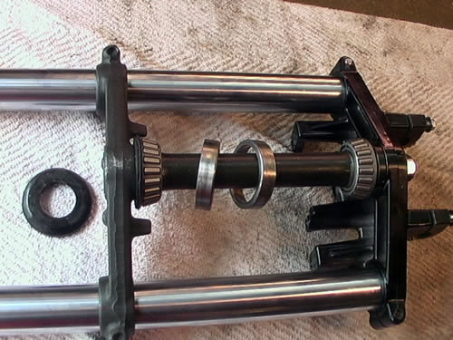 A gauche en bas, le cache poussière supérieur.Sur la colonne, les roulements coniques.
