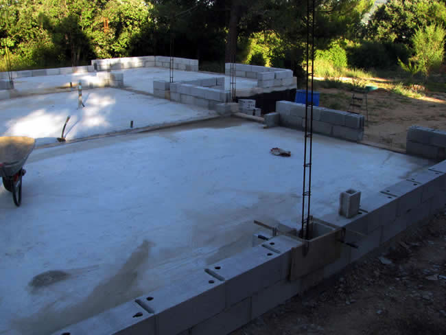 Deux rangs d'agglos pour limiter la surface, du bétonnage de finition .
