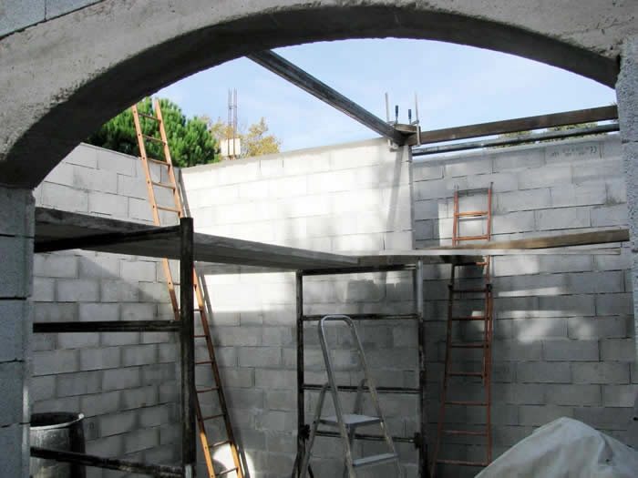 Vu de l'arc du salon. Le mur et les poutres.