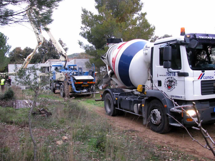 Le camion avec la toupie, va charger la pompe à béton...